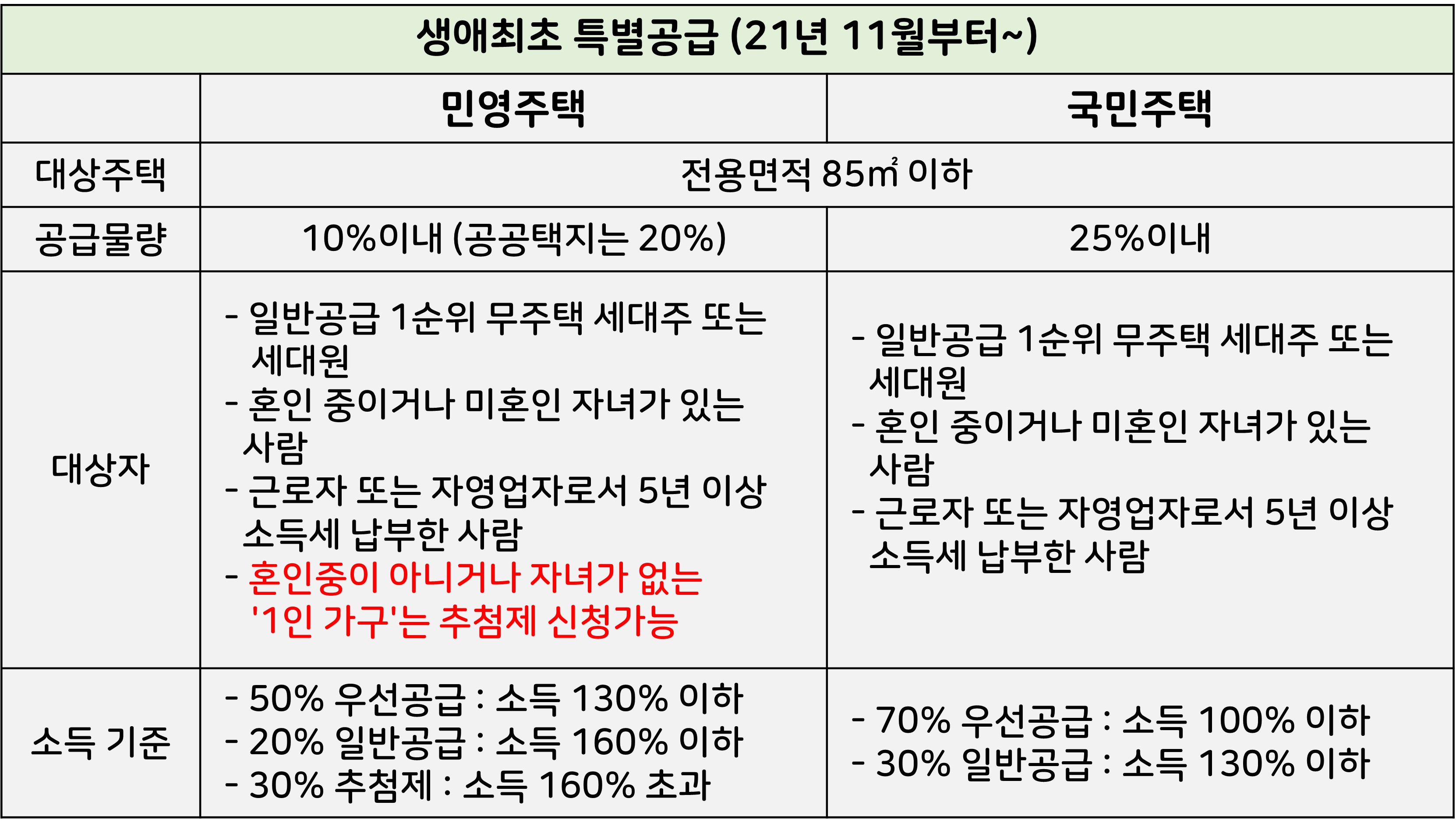 주택유형별 생애최초특별공급 특징