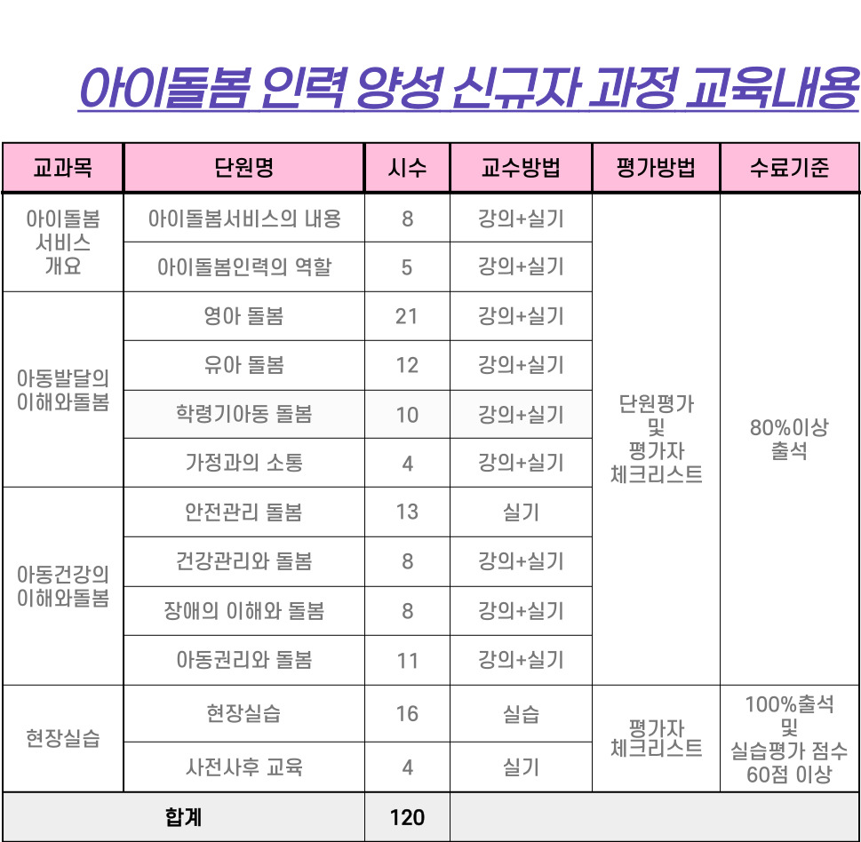 - 영아 전문 아이돌보미: 생후 3개월 이상 만 36개월 이하 영아 돌봄