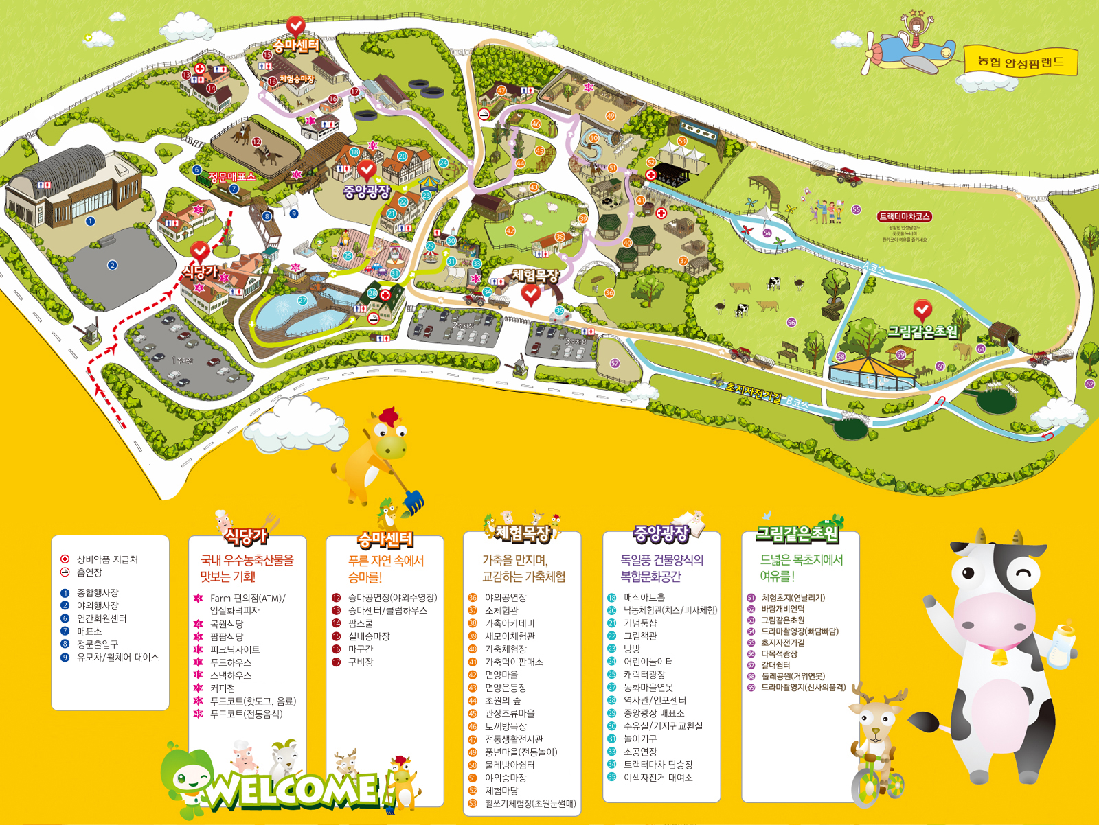 안성 팜랜드 내에는 다양한 식당과 카페가 있어 편리하게 식사와 휴식을 즐길 수 있습니다: