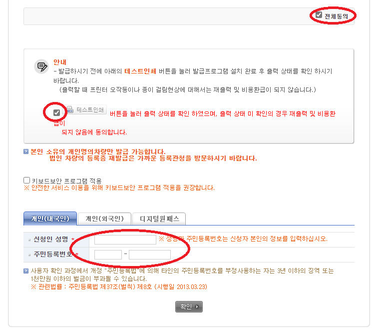- 차량 정보: 차량번호, 차종, 배기량 등이 올바른지 확인