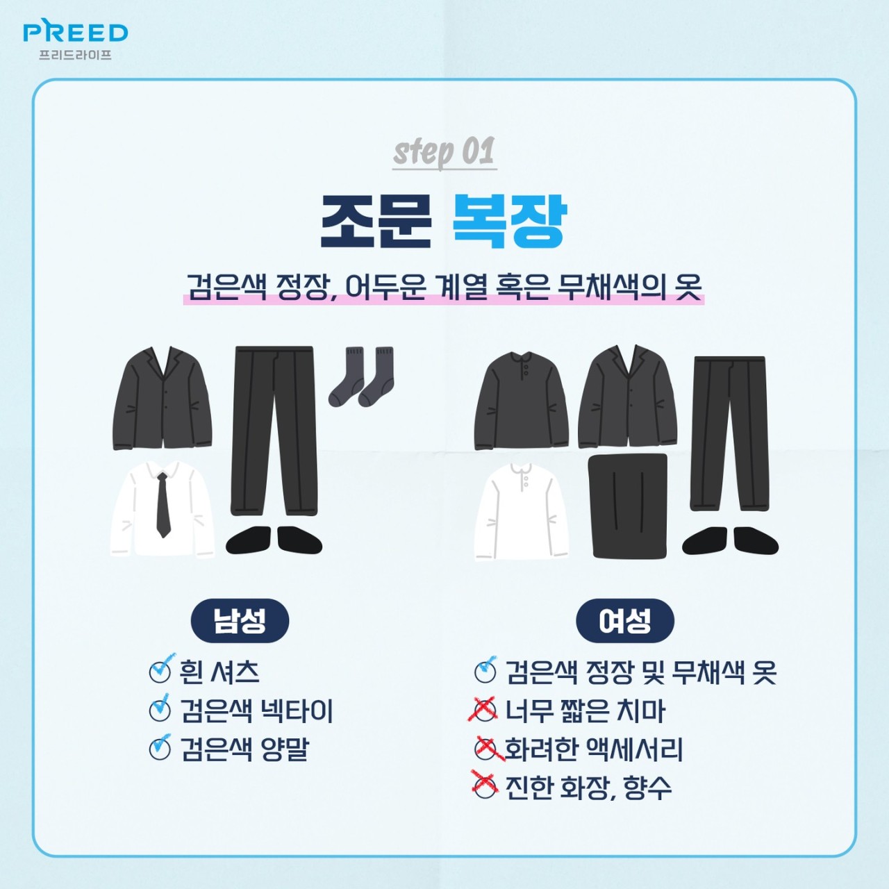 - 여성: 검정색 상의, 무채색 치마 또는 바지, 검정색 구두를 착용합니다.