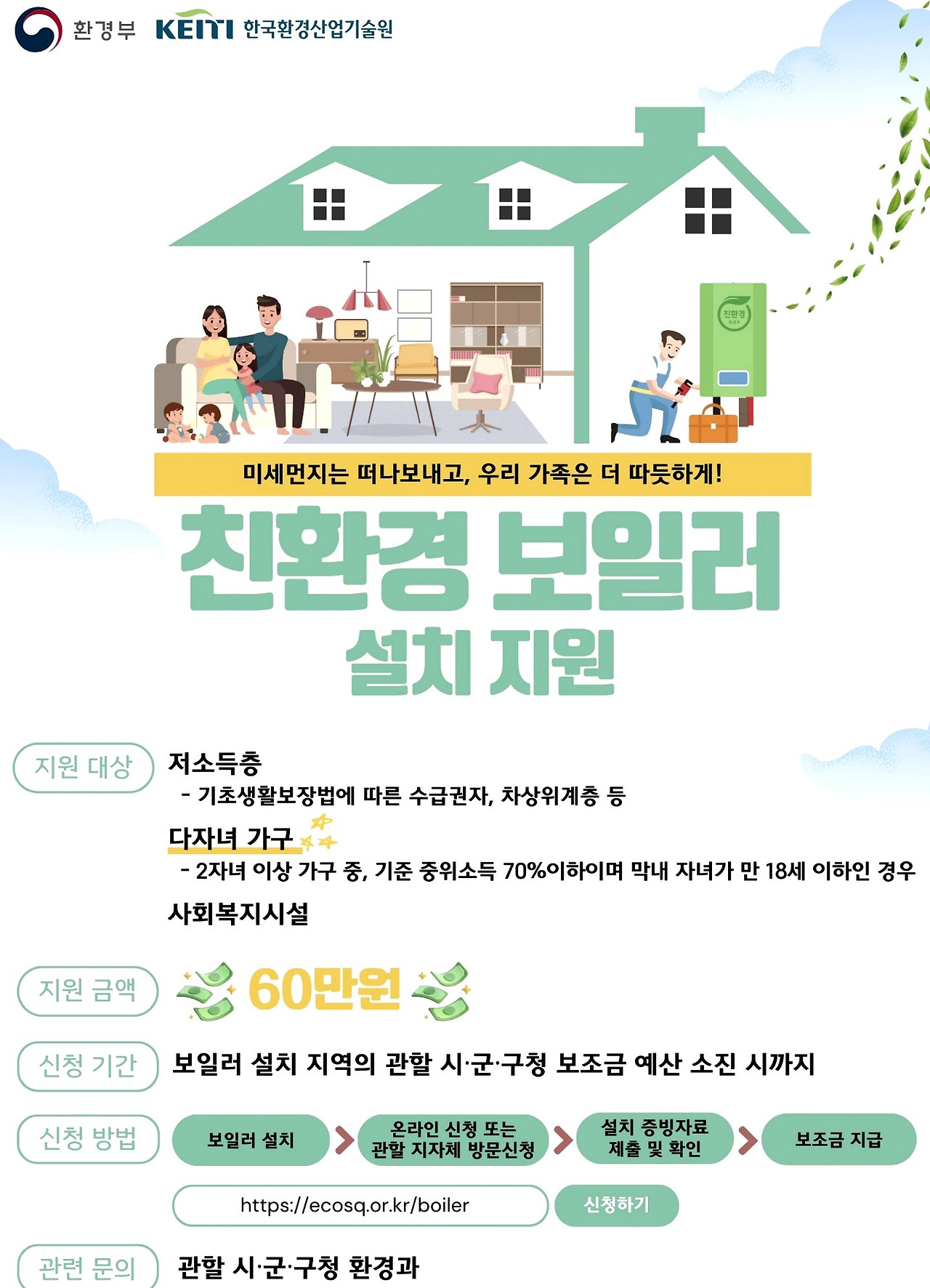더 자세한 정보나 문의사항이 있다면, 서울시의 경우 다산콜센터(120)나 각 구청의 환경업무 담당부서에 문의하실 수 있습니다. 여러분의 건강한 생활과 지속 가능한 미래를 위해 친환경 보일러 교체를 고려해보시기 바랍니다.