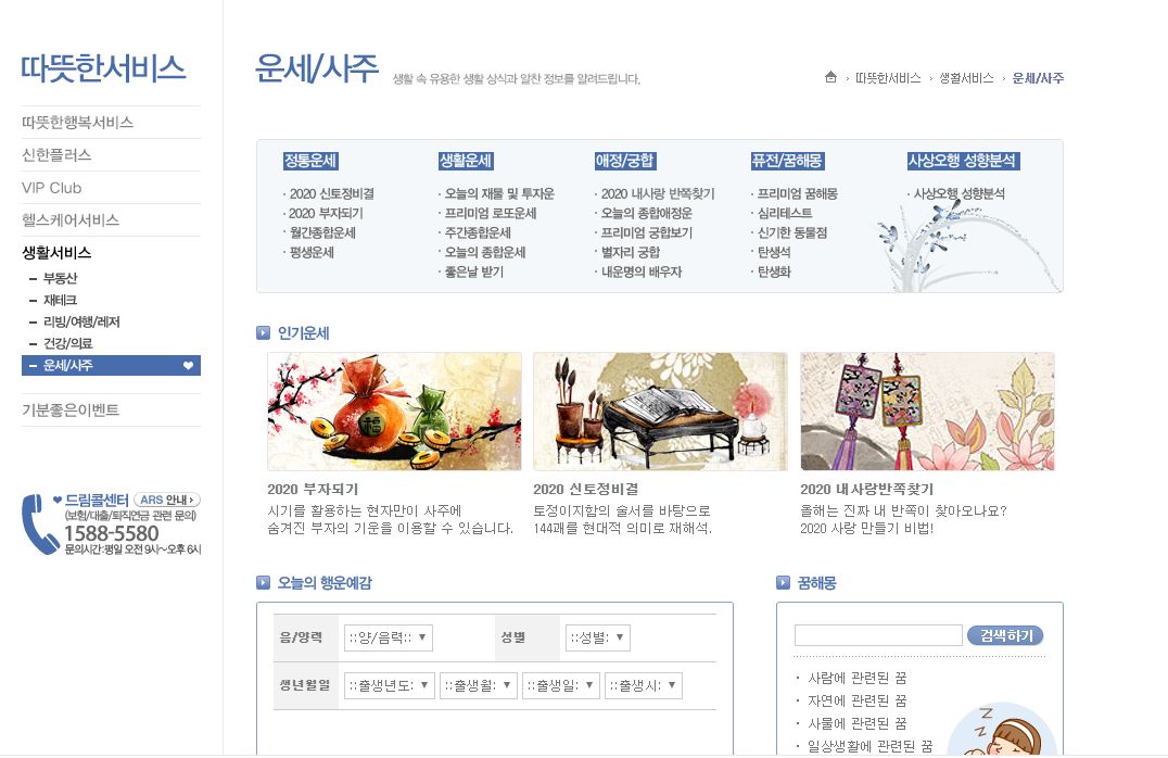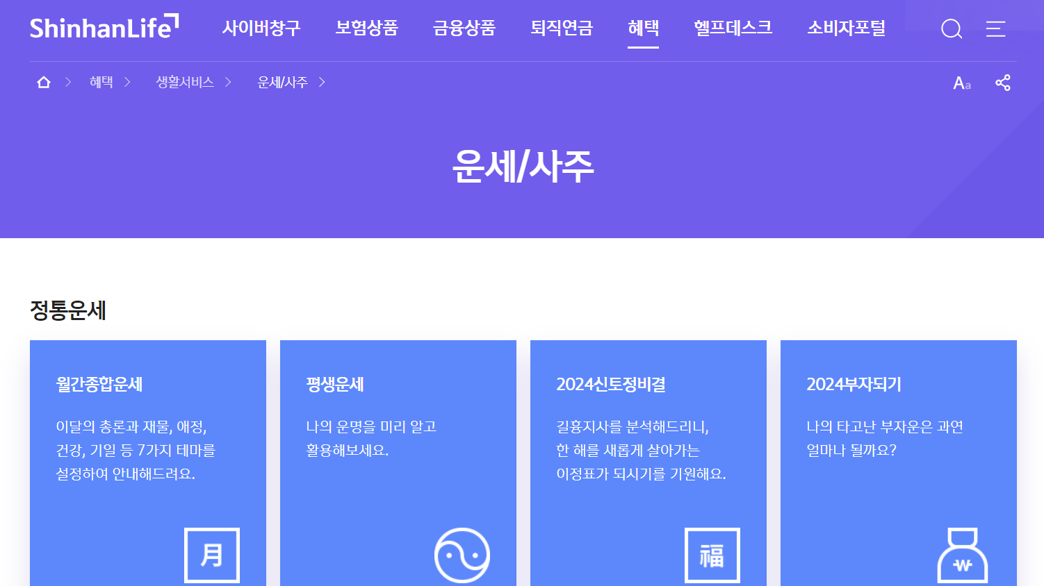 2025년 신년운세와 무료 사주, 토정비결 보는 방법을 상세히 안내합니다. 신한생명의 다양한 운세 서비스를 통해 새해 운세를 확인하고, 정통운세부터 생활운세, 애정운까지 한 눈에 살펴보세요.