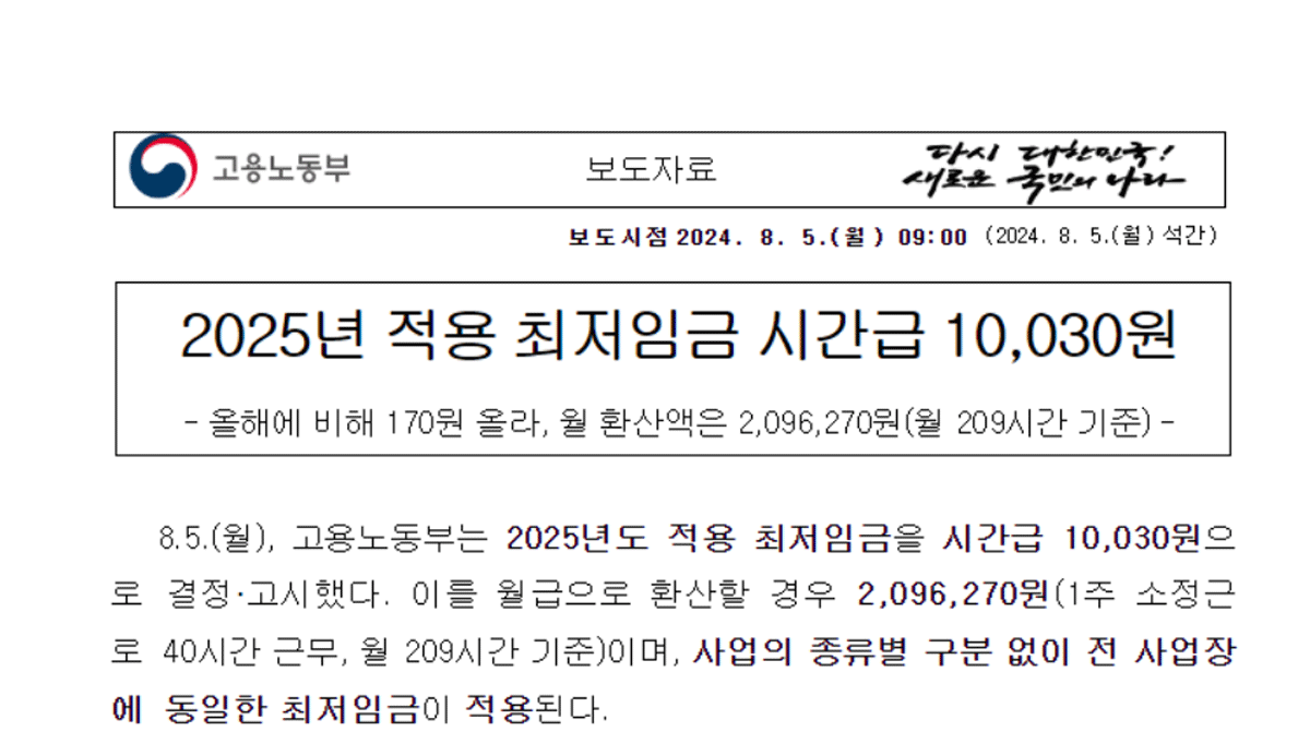 2025년 최저임금은 시간당 10,030원으로, 처음으로 1만원을 돌파했습니다. 고용노동부에서 발표한 이 최저임금은 2025년 1월 1일부터 전국 모든 사업장에 적용됩니다.